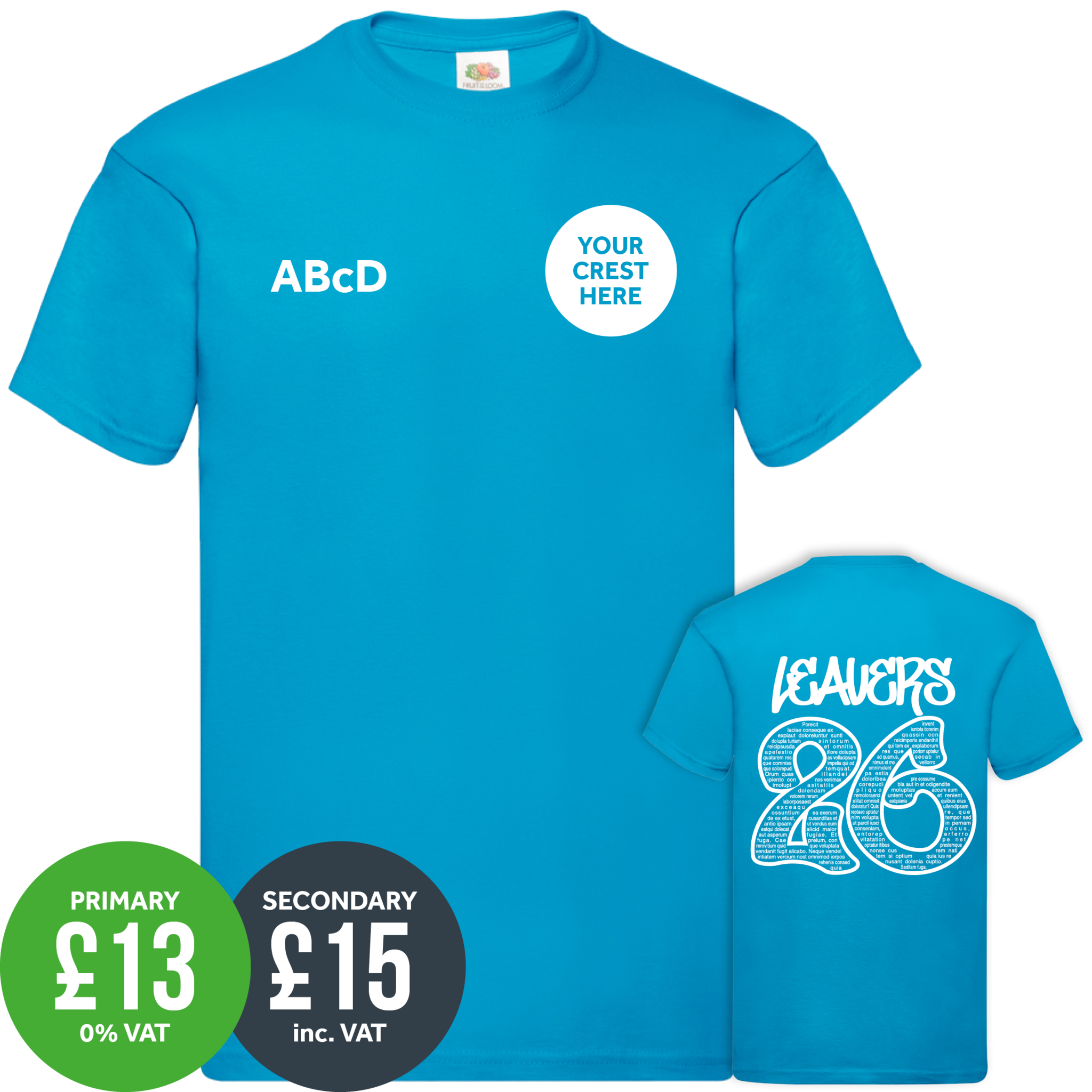 All t-shirts will come preprinted with your school logo and Leavers design.